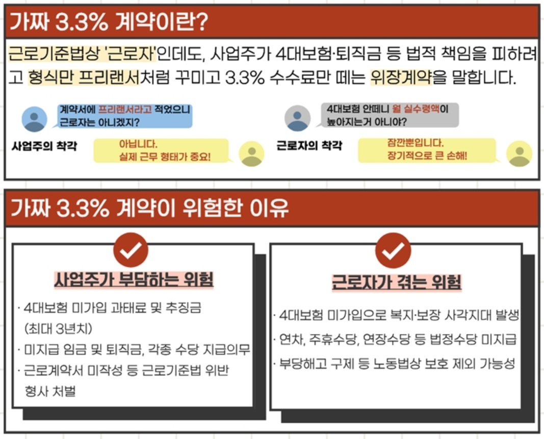이에 고용노동부는 최근 “가짜 3.3 계약 등 불법적 관행에 대한 현장 지도·감독을 강화하겠다”고 밝힌 바 있다.
